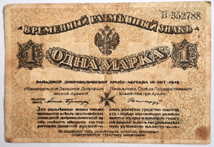 | Nosaukums | Vienas markas pagaidu maiņas monēta, ko 1919. gada 10. oktobrī Mitauā izdeva Rietumu brīvprātīgo armija. Šīs banknotes, kas pazīstamas arī kā ģenerāļa |