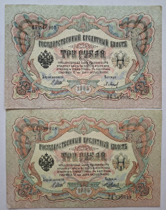 Divas 3 rubļu banknotes no 1905. gada. Krievijas impērija.