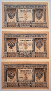 Trīs 1 rubļa banknotes no 1898. gada. Krievijas impērija.