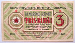 1919. gada 3 rubļu banknote, ko izlaida Rīgas Strādnieku deputātu padome.