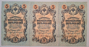Trīs 5 rubļu banknotes no 1909. gada, Krievijas impērija. Stāvoklis!