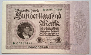 Veimāras Vācijas 100 000 marku banknote, izdota 1923. gadā.