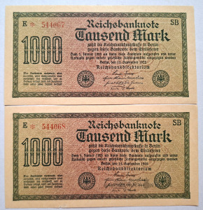 Divas 1000 marku banknotes, ko 1922. gadā izlaida Reihsbanka. Secīgi numuri. Stāvoklis!!!!