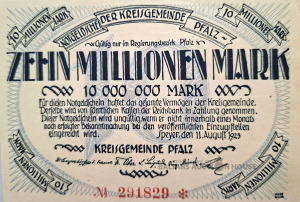 Šī ir notgelda (ārkārtas nauda) 10 miljonu marku vērtībā, ko 1923. gadā izlaida Pfalcas apriņķa kopiena (Kreisgemeinde Pfalz).
