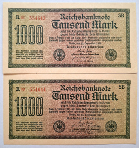 Divas 1000 marku banknotes, ko 1922. gadā izlaida Reihsbanka. Secīgi numuri. Stāvoklis!!!!