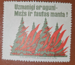 Reklamas pastmarka. Uzmanīgi ar uguni. Mežs ir tautas manta.