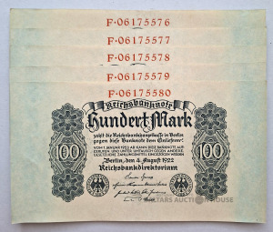 Piecas Vācijas impērijas 100 marku banknotes, izlaistas 1922. gadā (sērija F.06175576-F.06175580).