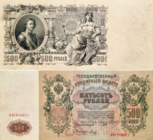 Krievijas impērijas valsts kredīta banknote ar nominālvērtību 500 rubļu, izdota 1912. gadā.