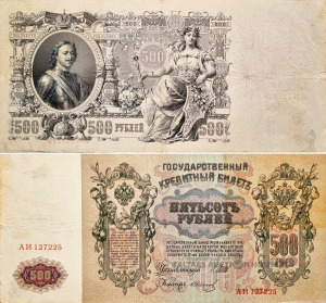 Krievijas impērijas valsts kredīta banknote ar nominālvērtību 500 rubļu, izdota 1912. gadā.