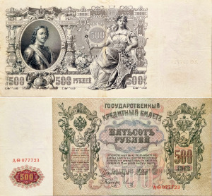 Krievijas impērijas valsts kredīta banknote ar nominālvērtību 500 rubļu, izdota 1912. gadā.