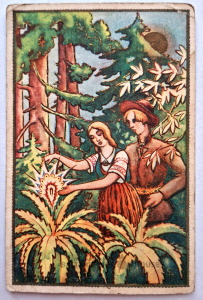 Pastkarte, kurā attēlota aina no latviešu tautas pasakas vai mīta, kas saistīta ar Līgo dienas svinēšanu.