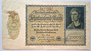 Vācijas impērijas 10 000 marku banknote (Reiha banknote), kas izlaista 1922. gadā.