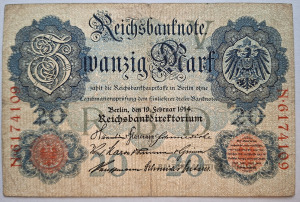 Vācijas impērijas banknote 20 marku nominālvērtībā, izdota 1914. gadā.