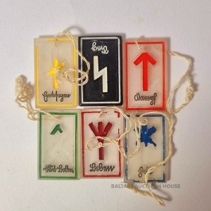 Sešu stikla rūnu kulonu (žetonu) komplekts, ko izdevusi Vācijas Jaunatnes māību nams (DJH) kā daļu no kampaņas “Winterhilfswerk” (WHW). 1940. gads.