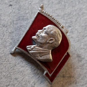 Padomju atloka nozīmīte ar Vladimira Iļjiča Ļeņina profilu uz sarkana karoga fona.