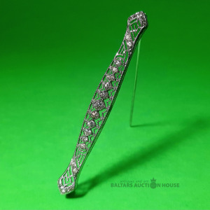Art Deco stila piespraude ar baltiem akmeņiem. Sudrabs, 925. prove. Svars 5,55 grami. Augstums 7 cm.