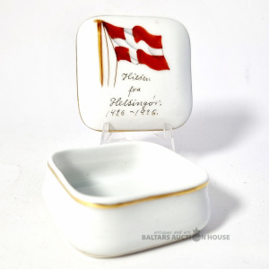 Maza porcelāna kārbiņa ar Dānijas karogu, V.J.S. 1926. 5 cm x 5 cm.