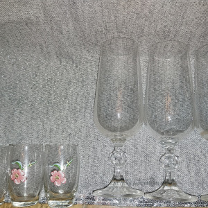 6 stikla glāzes: 3 mazas glāzes ar puķu attelojumiem: H 6.5 cm D 3.5 cm., 3 garās glāzes ar dekoratīvu stikla bumbuli: H 17 cm D 4.5 cm.