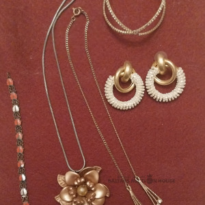 Eleganta bižutērija: 2 kaklarotas (Art deco stilā un romantiska stilā) 2 aproces 1 auskaru pāris.