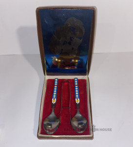 Bērnu komplekts, kas sastāv no 6 karotēm un 1 knaiblēm. Emalja. Jauns, nekad nelietots.