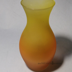 Krāsaina stikla vāze, augstums 18 cm, diametrs 9 cm. Vāzes krāsa no brūni oranžas vāzes apakšdaļā pamazām pāriet saulespuķu dzeltenā
