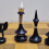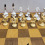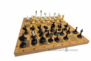 Šaha dēlis ar nepilnu šaha figūru komplektu, dažām figūrām ir defekti.