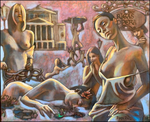 Dags Vidulejs. Rīgas operas sirēnas. 2022. gads. Audekls, zelta lapiņas, akrils, eļļa. Izmērs 65x 80 cm.