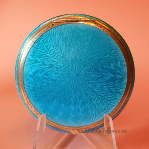 Antīka sudraba pūdera kompaktā forma ar zilu giloša emalju, ap 1910. gadu. F&B 925. Foster & Bailey. Svars: 50 grami. Diametrs: 5 cm. Stāvoklis: Skatīt fotoattēlu.