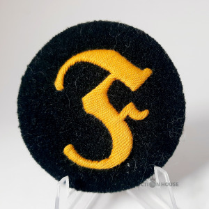 Ar mašīnu izšūts ševrons ar gotisku burtu "F" zeltaini dzeltenā diegā, kas apzīmē Feuerwerker (arsenāla tehniķi). Šis eksemplārs ir ļoti labā stāvoklī.