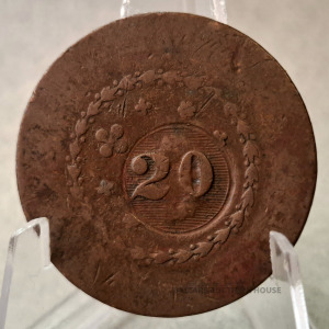 Brazīlijas impērijas 20 reālu (reisu) monēta. Uz vecākas monētas ir pretzīme (atkārtoti kalta).