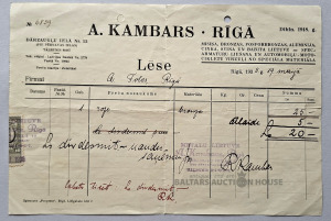 Šis ir sens rēķins no Rīgas, datēts ar 1938. gada 19. maiju. Uzņēmums: A. Kambara lietuve, dibināta 1918. gadā, atrodas Darzaugļu ielā. Specializācija: Rūpnīca lēja misiņa, bronzas, alumīnija, cinka un citus metāla izstrādājumus, tostarp virzuļus automašīnām un motocikliem. Saturs: Dokumentā fiksēta bronzas izstrādājuma pārdošana par 20 latiem (ar atlaidi). Konteksts: Dokuments ir starpkaru Latvijas biznesa sarakstes un tirdzniecības piemērs.