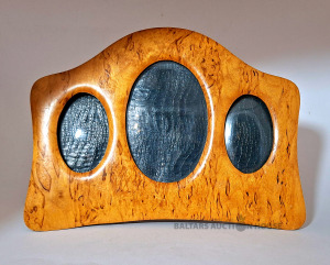 Art Deco stila foto rāmis, ražots Eiropā 20. gadsimta 20. un 30. gados no Karēlijas bērza. Materiāli: koks (Karēlijas bērzs), kartons, stikls. Stils: Art Deco. Izmēri: aptuveni 29 cm augsts, 21 cm augsts. Īpašības: trīs ovāli foto logi. Centrālais stikls ir taisns, bet sānu stikls ir izliekts.