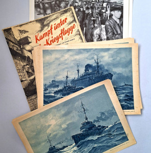 Vācu mape ar Otrā pasaules kara ilustrācijām ar nosaukumu "Cīņa zem kaujas karoga". Nosaukums: Kampf unter der Kriegsflagge (Cīņa zem kaujas karoga). Saturs: Mapē ir 34 attēli, tostarp jūras mākslinieka Ādolfa Boka zīmējumi un Vācijas Jūras kara flotes (Kriegsmarine) kara