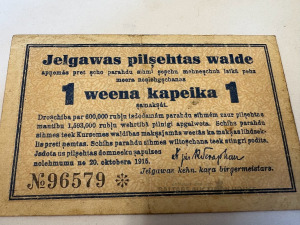 Jelgavas pilsētas valdes izdotā 1 kap. banknote 1915.g.
