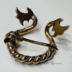 Pakavsakta ar zvēru galvām, etnogrāfiskā krekla sakta, amatnieka roku darbs, sarkandzeltena bronza, lielums 40x45 mm, svars 20 grami, no privātkolekcijas, nav bijusi lietošanā.