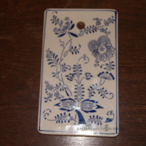 Fajans /keramikas dēlītis ar ikonisko "sīpolu rakstu" (Zwiebelmuster) kobalta zilā krāsā. Paredzēts siera vai brokastu servēšanai,