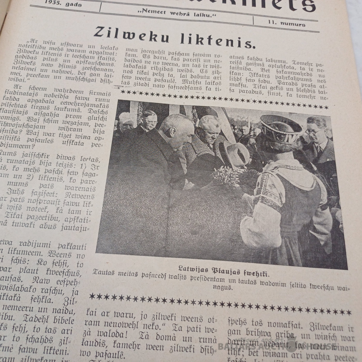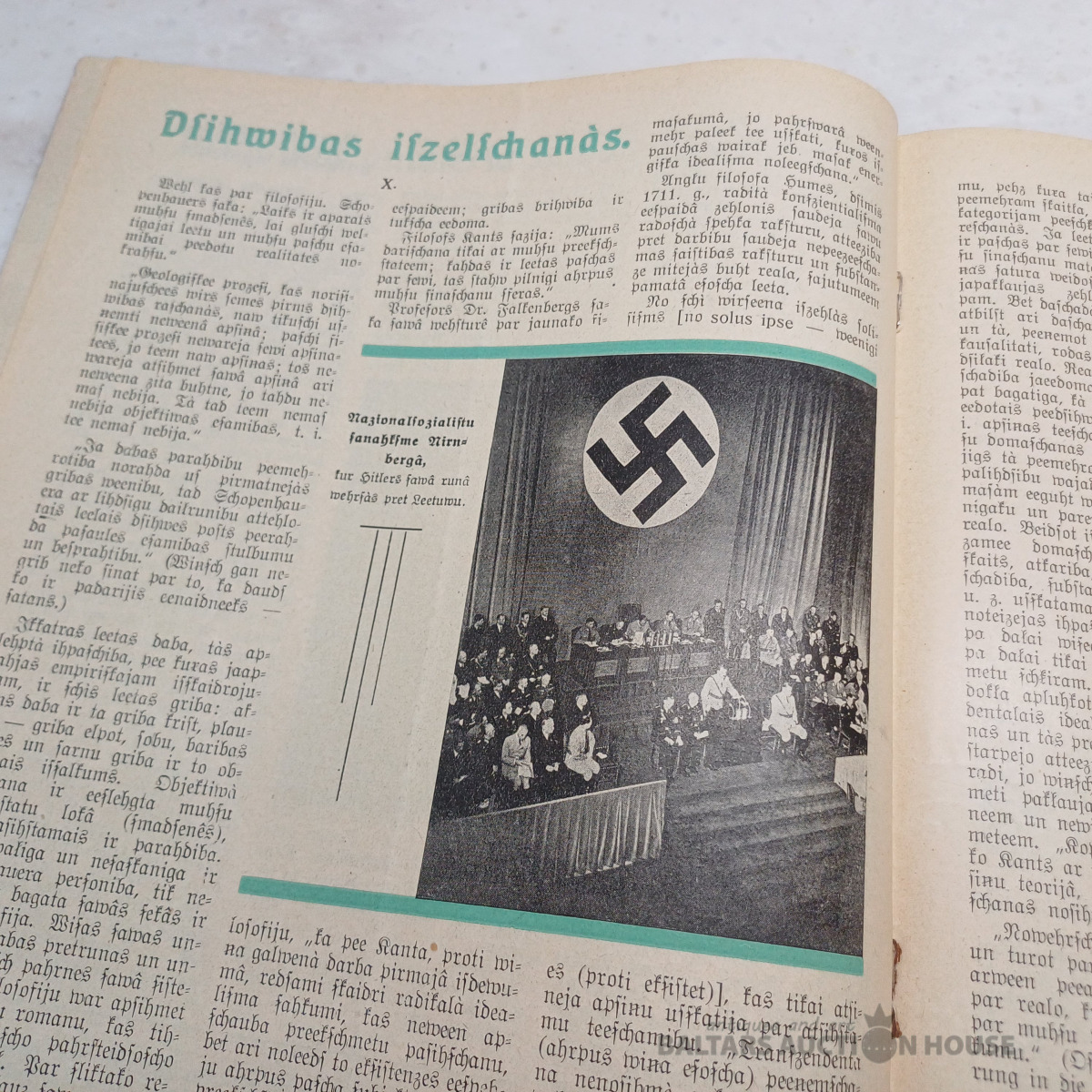 Mūsu laikmets. 1935/11. NACISMS. Saturā Ulmaņa bildes un nacistu sanāksmes bilde ar kāškrustu. Skatīt bildēs
