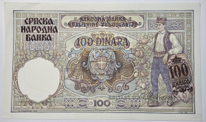 Banknote Serbija/Serbia, 100 Dinara 1941 overprint on 100 Dinari Jugoslavia 1929 b-note, P23, UNC