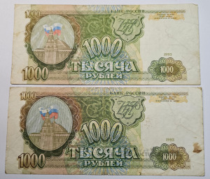 Banknotes, Krievija 1 000 Rubļi, 1993, ūdenszīmes 2 varianti ( Zvaigznes virzieni \ un / )