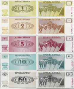 6 Banknotes komplekts, Slovēnija, 1, 2, 5, 10, 50, 100 Tolarjev, 1990, UNC
