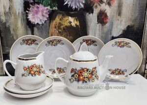 Servīzes daļa Aija-1. Zeltījuma zudums uz vāciņa. Rūpniecības defekts uz tējkannas.