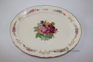 Ovāls servējamais trauks, klasisks ziedu pušķis ar rozēm, ko papildina zeltīta apmale. Porcelāns. Stavangerflint, Norvēģija. 29x38 cm