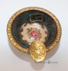 Pelnu trauks, kas rotāts ar smalku izšuvumu un iestrādāts dekoratīvā rāmī. d=6,5 cm