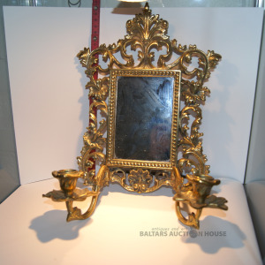 Elegants antīks bronzas spogulis-svečturis (žirandols) izsmalcināts, grezns sienas spogulis ar diviem integrētiem svečturiem, kas izgatavots klasiskā rokoko stilā.